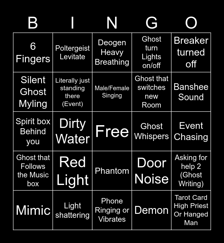 This bingo card has a free space and 24 words: Mimic, Red Light, Male/Female Singing, Demon, Breaker turned off, 6 Fingers, Poltergeist Levitate, Deogen Heavy Breathing, Ghost Whispers, Event Chasing, Spirit box Behind you, Literally just standing there (Event), Door Noise, Asking for help 2 (Ghost Writing), Silent Ghost Myling, Light shattering, Phone Ringing or Vibrates, Ghost turn Lights on/off, Banshee Sound, Ghost that Follows the Music box, Dirty Water, Phantom, Ghost that switches new Room and Tarot Card High Priest Or Hanged Man.