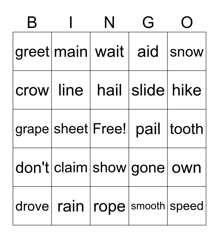 This bingo card has a free space and 26 words: show, smooth, hail, rain, snow, greet, crow, main, tooth, gone, slide, grape, own, drove, sheet, blow, aid, don't, wait, speed, hike, rope, pail, claim, line and joke.