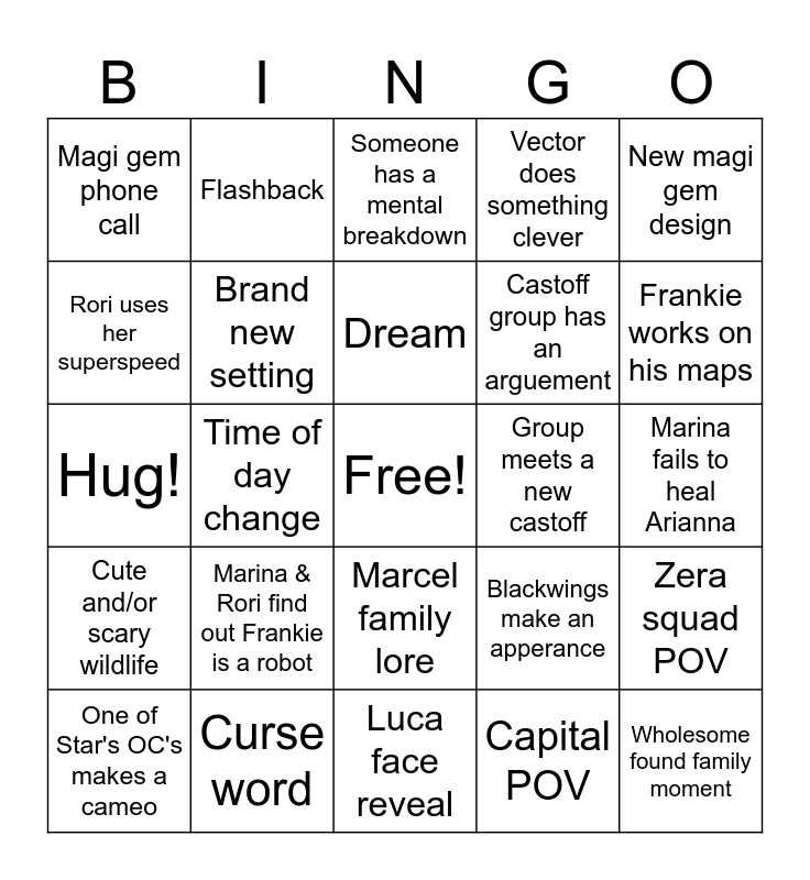 This bingo card has a free space and 24 words: Marina & Rori find out Frankie is a robot, Curse word, Dream, One of Star's OC's makes a cameo, New magi gem design, Magi gem phone call, Rori uses her superspeed, Flashback, Group meets a new castoff, Marcel family lore, Castoff group has an arguement, Hug!, Blackwings make an apperance, Zera squad POV, Brand new setting, Capital POV, Marina fails to heal Arianna, Someone has a mental breakdown, Frankie works on his maps, Time of day change, Wholesome found family moment, Cute and/or scary wildlife, Vector does something clever and Luca face reveal.
