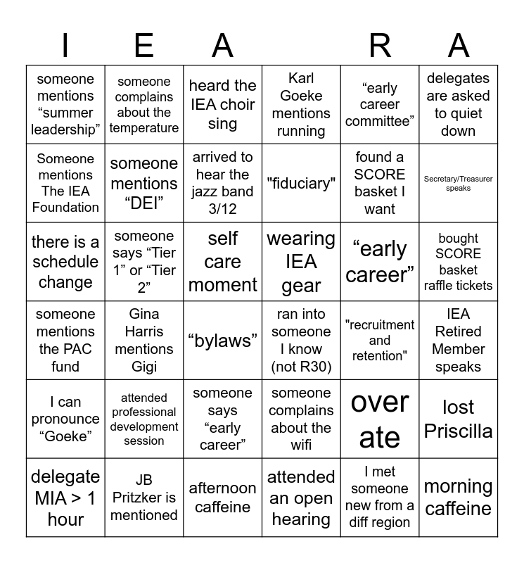 This bingo card has 47 words: “micro grants”, there is a schedule change, there is a standing ovation, "recruitment and retention", “early career”, someone complains about the wifi, someone complains about the temperature, "stronger united", delegates are asked to quiet down, JB Pritzker is mentioned, Someone mentions The IEA Foundation, Karl Goeke mentions running, Gina Harris mentions Gigi, someone mentions the PAC fund, I met someone new from a diff region, someone says “early career”, someone mentions “DEI”, someone says “Tier 1” or “Tier 2”, “1st time delegate”, “early career committee”, Secretary/Treasurer speaks, IEA Retired Member speaks, someone mentions “summer leadership”, arrived to hear the jazz band 3/12, “justice”, "fiduciary", “bylaws”, calculated my TRS retirement age, bought SCORE basket raffle tickets, wearing IEA gear, attended professional development session, attended professional development session, attended an open hearing, morning caffeine, afternoon caffeine, ran into someone I know (not R30), self care moment, delegate MIA > 1 hour, played BINGO, over ate, I can pronounce “Goeke”, heard the IEA choir sing, found a SCORE basket I want, someone got an award, learned something from PD, lost Priscilla and “Do you have Advil/ ibuprofen?”.