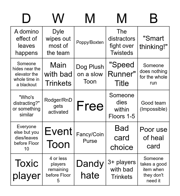 This bingo card has a free space and 28 words: Someone leaves before the game starts, 4 or less players remaining before Floor 5, Dog Plush on a slow Toon, 3+ players with bad Trinkets, "Smart thinking!", A domino effect of leaves happens, Main with bad Trinkets, Dandy hate, Someone dies within Floors 1-5, Poor use of heal card, "Who's distracting?" or something similar, Rodger/RnD gets activated, Bad card choice, Someone takes a good item when they don't need it, Someone hides near the elevator the whole time in a blackout, 3+ hits on one Floor with only commons, Fancy/Coin Purse, The distractors fight over Twisteds, Someone does nothing for the whole run, Toxic player, Dyle wipes out most of the team, Support/healer Toon doesn't do their job properly, "Speed Runner" Title, Good team (Impossible), Everyone else but you dies/leaves before Floor 10, Event Toon, Poppy/Boxten and Player with a DW-related name.