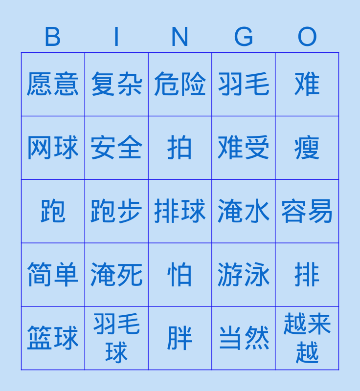 This bingo card has 25 words: 简单, 羽毛球, 排球, 当然, 难, 愿意, 复杂, 危险, 淹水, 排, 网球, 安全, 胖, 游泳, 瘦, 篮球, 跑步, 拍, 难受, 容易, 跑, 淹死, 怕, 羽毛 and 越来越.