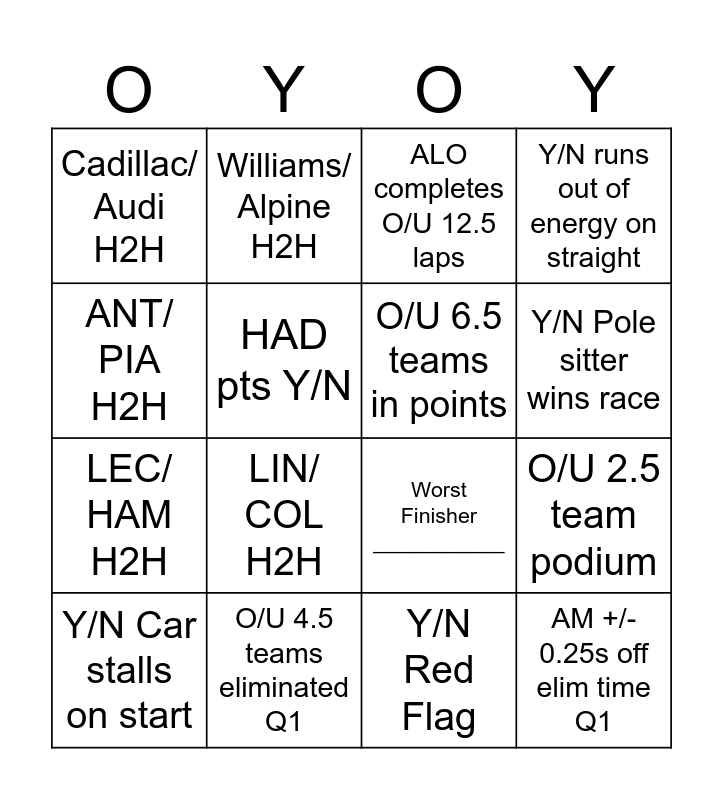 This bingo card has 16 words: O/U 4.5 teams eliminated Q1, O/U 2.5 team podium, ALO completes O/U 12.5 laps, Cadillac/ Audi H2H, LEC/ HAM H2H, Williams/ Alpine H2H, Worst Finisher ___________, Y/N Red Flag, ANT/ PIA H2H, HAD pts Y/N, Y/N Car stalls on start, Y/N runs out of energy on straight, LIN/ COL H2H, Y/N Pole sitter wins race, O/U 6.5 teams in points and AM +/- 0.25s off elim time Q1.