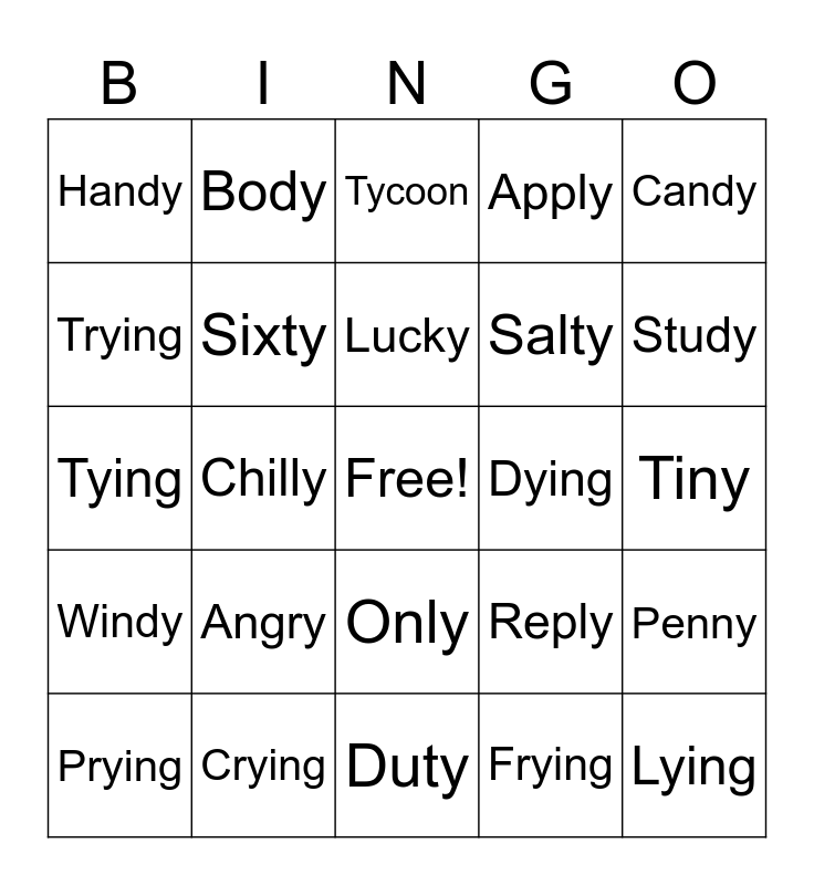 This bingo card has a free space and 24 words: Angry, Crying, Lucky, Prying, Candy, Handy, Trying, Body, Dying, Only, Salty, Tying, Reply, Penny, Sixty, Frying, Tiny, Tycoon, Study, Chilly, Lying, Windy, Apply and Duty.