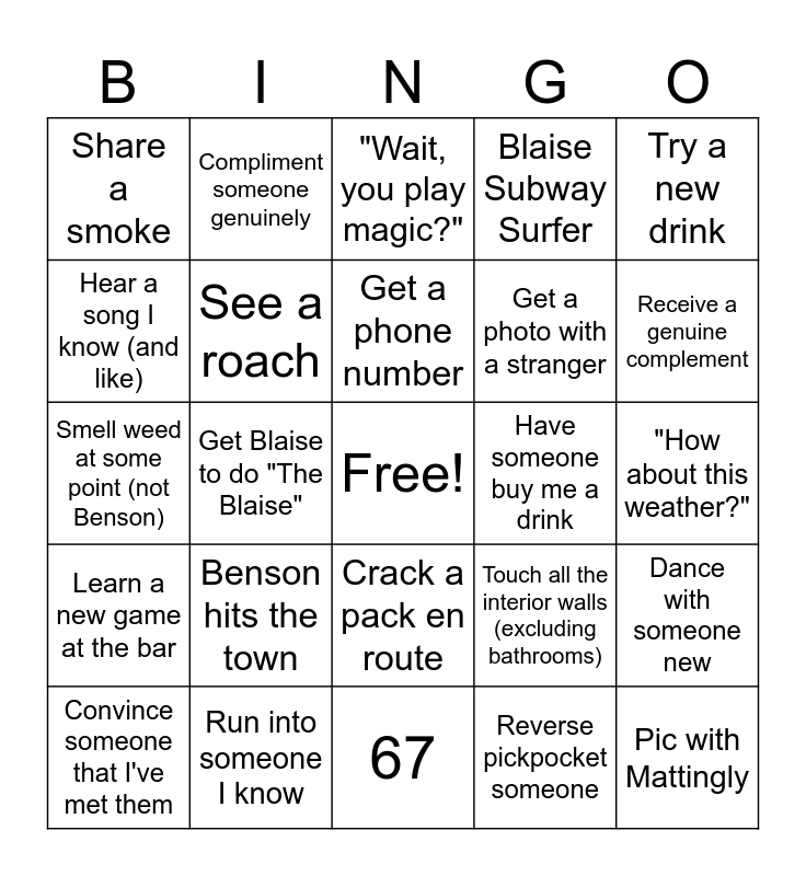 This bingo card has a free space and 24 words: Benson hits the town, Run into someone I know, Get a phone number, Convince someone that I've met them, Try a new drink, Share a smoke, Hear a song I know (and like), Compliment someone genuinely, Have someone buy me a drink, Crack a pack en route, Get a photo with a stranger, Smell weed at some point (not Benson), Touch all the interior walls (excluding bathrooms), Dance with someone new, See a roach, Reverse pickpocket someone, "How about this weather?", "Wait, you play magic?", Receive a genuine complement, Get Blaise to do "The Blaise", Pic with Mattingly, Learn a new game at the bar, Blaise Subway Surfer and 67.