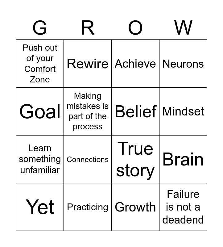 This bingo card has 16 words: Practicing, Brain, Achieve, Push out of your Comfort Zone, Learn something unfamiliar, Rewire, True story, Growth, Goal, Making mistakes is part of the process, Yet, Neurons, Connections, Mindset, Belief and Failure is not a deadend.