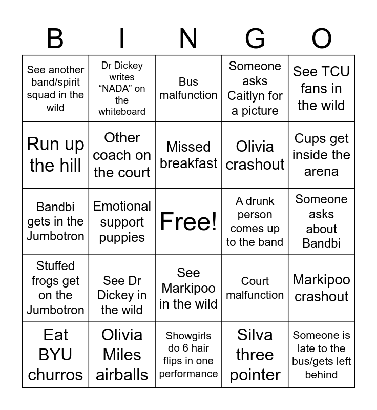 This bingo card has a free space and 24 words: See Dr Dickey in the wild, Olivia Miles airballs, Missed breakfast, Eat BYU churros, See TCU fans in the wild, See another band/spirit squad in the wild, Run up the hill, Dr Dickey writes “NADA” on the whiteboard, A drunk person comes up to the band, See Markipoo in the wild, Olivia crashout, Bandbi gets in the Jumbotron, Court malfunction, Markipoo crashout, Other coach on the court, Silva three pointer, Someone asks about Bandbi, Bus malfunction, Cups get inside the arena, Emotional support puppies, Someone is late to the bus/gets left behind, Stuffed frogs get on the Jumbotron, Someone asks Caitlyn for a picture and Showgirls do 6 hair flips in one performance.