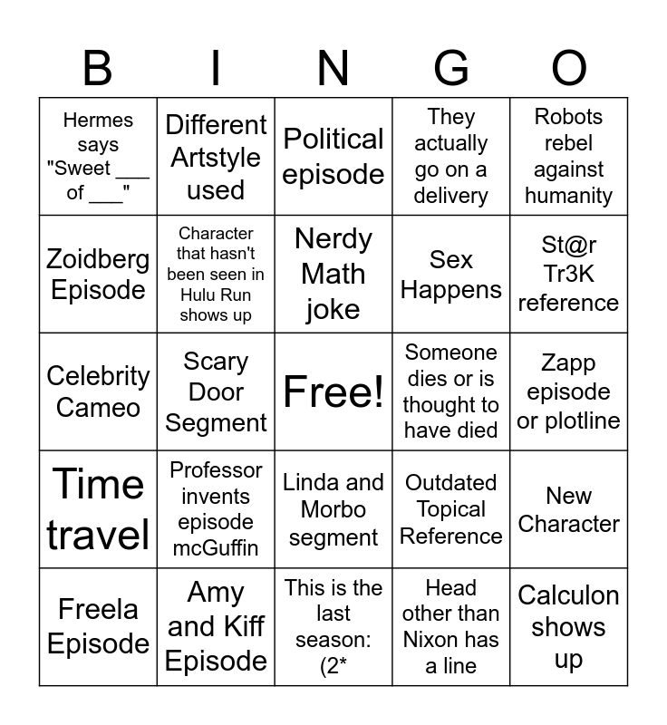 This bingo card has a free space and 24 words: Professor invents episode mcGuffin, Amy and Kiff Episode, Nerdy Math joke, Freela Episode, Robots rebel against humanity, Hermes says "Sweet ___ of ___", Zoidberg Episode, Different Artstyle used, Someone dies or is thought to have died, Linda and Morbo segment, Sex Happens, Celebrity Cameo, Outdated Topical Reference, New Character, Character that hasn't been seen in Hulu Run shows up, Head other than Nixon has a line, Zapp episode or plotline, Political episode, St@r Tr3K reference, Scary Door Segment, Calculon shows up, Time travel, They actually go on a delivery and This is the last season:(2*.