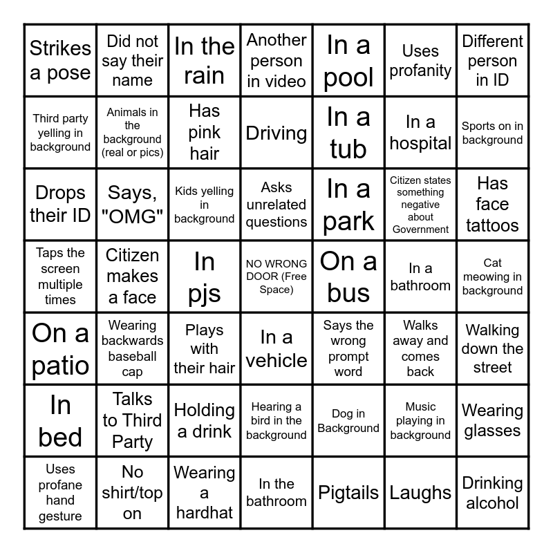 This bingo card has a free space and 48 words: Dog in Background, In a hospital, In the bathroom, Citizen makes a face, Kids yelling in background, Cat meowing in background, Did not say their name, No shirt/top on, Uses profanity, In a vehicle, Different person in ID, Another person in video, Citizen states something negative about Government, In a park, In bed, In a bathroom, Third party yelling in background, Sports on in background, Music playing in background, In a pool, In a tub, In pjs, Strikes a pose, Animals in the background (real or pics), Wearing glasses, Has pink hair, Has face tattoos, Uses profane hand gesture, Asks unrelated questions, Says, "OMG", Laughs, On a bus, Walking down the street, Talks to Third Party, Taps the screen multiple times, Says the wrong prompt word, Walks away and comes back, Drops their ID, Plays with their hair, Holding a drink, On a patio, Drinking alcohol, In the rain, Wearing a hardhat, Driving, Hearing a bird in the background, Wearing backwards baseball cap and Pigtails.