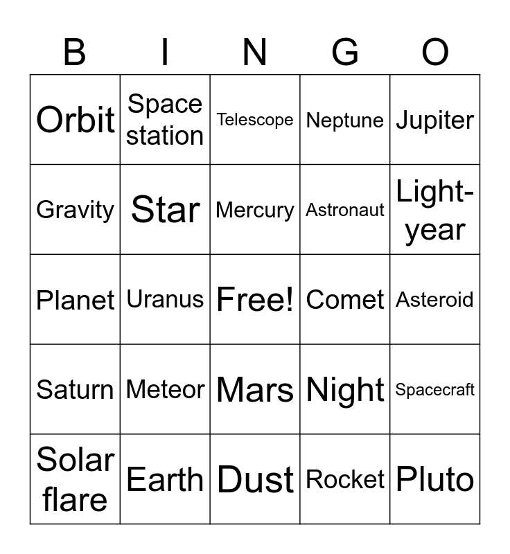 This bingo card has a free space and 40 words: Sun, Planet, Moon, Star, Earth, Mars, Mercury, Venus, Jupiter, Saturn, Uranus, Neptune, Pluto, Asteroid, Comet, Meteor, Meteorite, Orbit, Galaxy, Telescope, Spacecraft, Rocket, Astronaut, Gravity, Atmosphere, Ring, Crater, Satellite, Eclipse, Rotation, Revolution, Solar flare, Day, Night, Light-year, Dust, Capsule, Launch, Space station and Exploration.