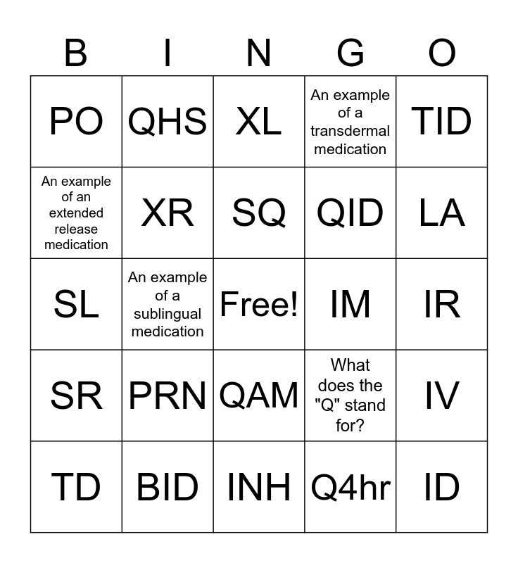 This bingo card has a free space and 24 words: PRN, BID, SQ, TD, TID, PO, An example of an extended release medication, QHS, IM, QAM, QID, SL, What does the "Q" stand for?, IV, XR, Q4hr, IR, XL, LA, An example of a sublingual medication, ID, SR, An example of a transdermal medication and INH.