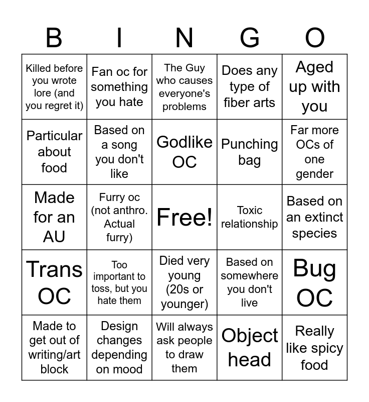 This bingo card has a free space and 34 words: 3 or less letters in their name, Object head, Has a prosthetic limb, Hetero- chromia (unnatural colors), Trans OC, Based on a song you don't like, Aged up with you, Made to get out of writing/art block, Fan oc for something you hate, Came up with them in a dream, Godlike OC, The Guy who causes everyone's problems, Based on something from before 1500, Rebellious noble trope, Toxic relationship, Far more OCs of one gender, Design changes depending on mood, Made for an AU, Too important to toss, but you hate them, Based on somewhere you don't live, Died very young (20s or younger), Legit war criminal, Killed before you wrote lore (and you regret it), Based on an extinct species, Will always ask people to draw them, Really like spicy food, Does any type of fiber arts, Really into a sport(s), Punching bag, Particular about food, Made after a significant style shift, Furry oc (not anthro. Actual furry), Bug OC and Undead OC.