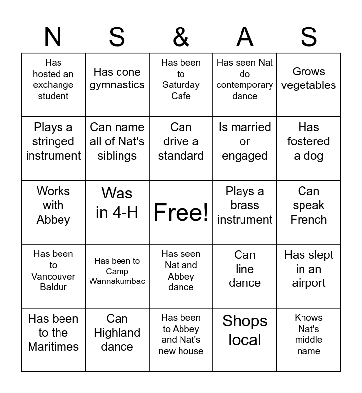 This bingo card has a free space and 24 words: Has been to Camp Wannakumbac, Can Highland dance, Can drive a standard, Has been to the Maritimes, Grows vegetables, Has hosted an exchange student, Plays a stringed instrument, Has done gymnastics, Plays a brass instrument, Has seen Nat and Abbey dance, Is married or engaged, Works with Abbey, Can line dance, Has slept in an airport, Can name all of Nat's siblings, Shops local, Can speak French, Has been to Saturday Cafe, Has fostered a dog, Was in 4-H, Knows Nat's middle name, Has been to Vancouver Baldur, Has seen Nat do contemporary dance and Has been to Abbey and Nat's new house.