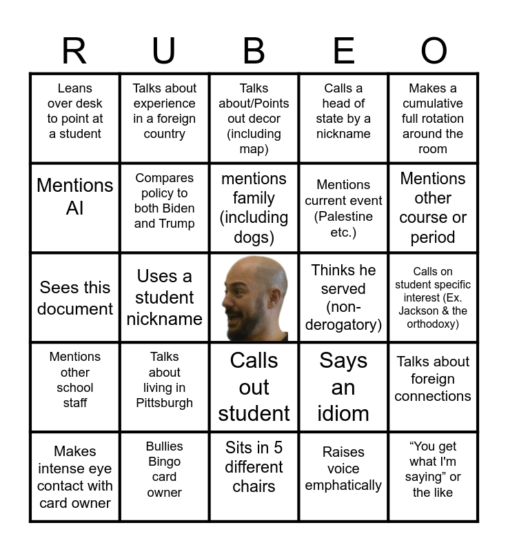 This bingo card has a free space and 24 words: Talks about living in Pittsburgh, Bullies Bingo card owner, mentions family (including dogs), Makes intense eye contact with card owner, Makes a cumulative full rotation around the room, Leans over desk to point at a student, Mentions AI, Talks about experience in a foreign country, Thinks he served (non-derogatory), Calls out student, Mentions current event (Palestine etc.), Sees this document, Says an idiom, Talks about foreign connections, Compares policy to both Biden and Trump, Raises voice emphatically, Calls on student specific interest (Ex. Jackson & the orthodoxy), Talks about/Points out decor (including map), Mentions other course or period, Uses a student nickname, “You get what I'm saying” or the like, Mentions other school staff, Calls a head of state by a nickname and Sits in 5 different chairs.