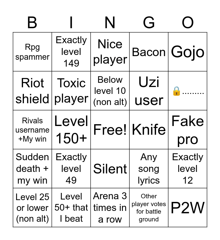 This bingo card has a free space and 29 words: Level 25 or lower (non alt), Fake noob, Level 150+, Sniper, Rpg spammer, Nice player, Toxic player, Exactly level 49, Knife, Level 50+ that I beat, Fake pro, P2W, Arena 3 times in a row, Other player votes for battle ground, 🔒........., Has a character in their display name, Silent, Sudden death + my win, Gojo, Rivals username +My win, Any song lyrics, Teammate disconnects and I win the 2v1, Uzi user, Riot shield, Bacon, Exactly level 149, Exactly level 12, Below level 10 (non alt) and All default.