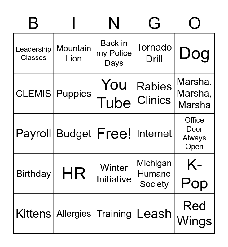 This bingo card has a free space and 29 words: Kittens, The Pitt, Budget, Busy times a comin', Leadership Classes, Back in my Police Days, Puppies, HR, Internet, Allergies, Office Door Always Open, Red Wings, Training, Leash, Marsha, Marsha, Marsha, Rescue, Winter Initiative, Birthday, Dog, Payroll, Michigan Humane Society, Dangerous Dog, Rabies Clinics, CLEMIS, Tornado Drill, Mountain Lion, K-Pop, You Tube and Taylor Swift.