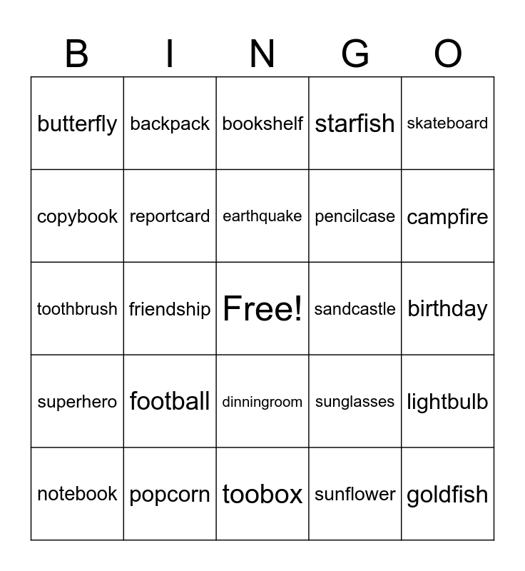 This bingo card has a free space and 25 words: football, toobox, earthquake, notebook, skateboard, butterfly, copybook, backpack, sandcastle, dinningroom, pencilcase, toothbrush, sunglasses, lightbulb, reportcard, bedroom, birthday, bookshelf, campfire, friendship, goldfish, popcorn, superhero, starfish and sunflower.