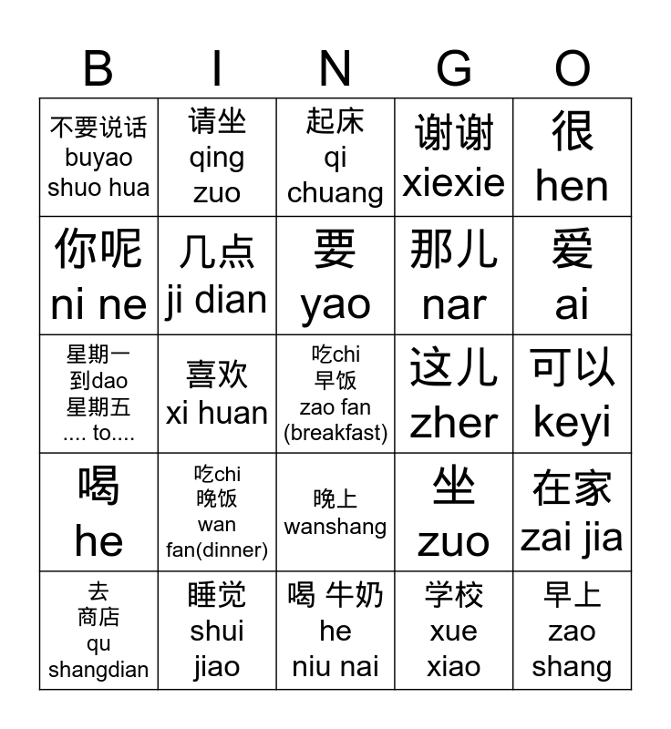 This bingo card has a free space and 24 words: 吃chi 晚饭 wan fan(dinner), 睡觉shui jiao, 要yao, 去 商店 qu shangdian, 很hen, 不要说话buyao shuo hua, 你呢 ni ne, 请坐 qing zuo, 这儿 zher, 晚上 wanshang, 那儿 nar, 星期一 到dao 星期五 .... to...., 坐 zuo, 在家 zai jia, 几点 ji dian, 学校 xue xiao, 可以 keyi, 起床 qi chuang, 爱 ai, 喜欢 xi huan, 早上 zao shang, 喝 he, 谢谢 xiexie and 喝 牛奶 he niu nai.