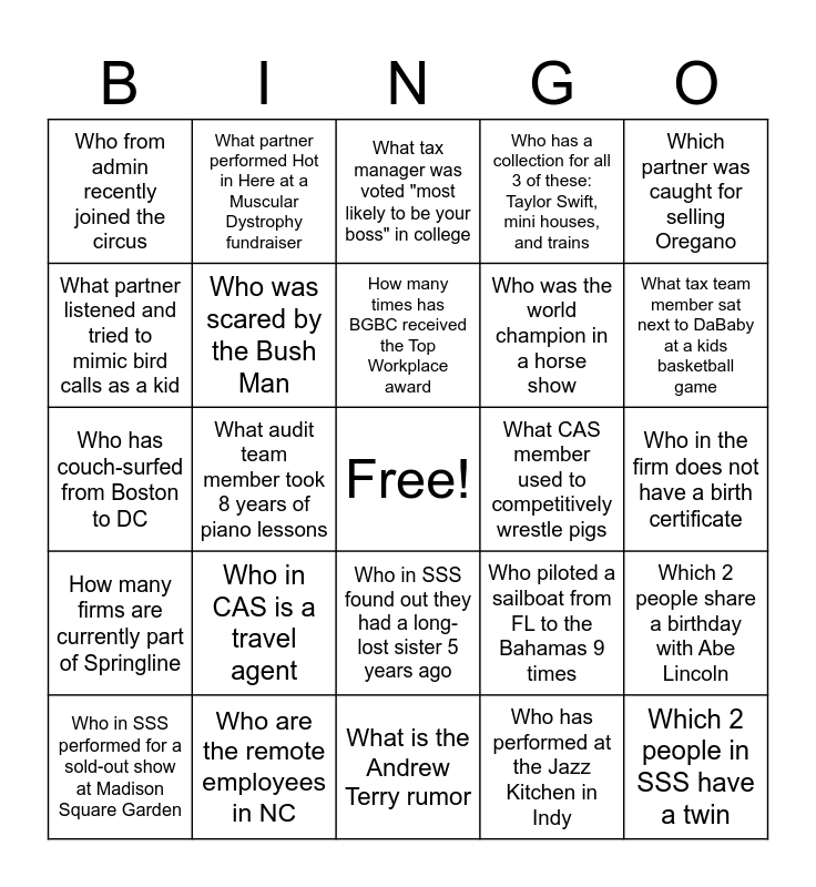This bingo card has a free space and 24 words: Who in CAS is a travel agent, Who are the remote employees in NC, How many times has BGBC received the Top Workplace award, Who in SSS performed for a sold-out show at Madison Square Garden, Which partner was caught for selling Oregano, Who from admin recently joined the circus, What partner listened and tried to mimic bird calls as a kid, What partner performed Hot in Here at a Muscular Dystrophy fundraiser, What CAS member used to competitively wrestle pigs, Who in SSS found out they had a long-lost sister 5 years ago, Who was the world champion in a horse show, Who has couch-surfed from Boston to DC, Who piloted a sailboat from FL to the Bahamas 9 times, Which 2 people share a birthday with Abe Lincoln, Who was scared by the Bush Man, Who has performed at the Jazz Kitchen in Indy, Who in the firm does not have a birth certificate, What tax manager was voted "most likely to be your boss" in college, What tax team member sat next to DaBaby at a kids basketball game, What audit team member took 8 years of piano lessons, Which 2 people in SSS have a twin, How many firms are currently part of Springline, Who has a collection for all 3 of these: Taylor Swift, mini houses, and trains and What is the Andrew Terry rumor.