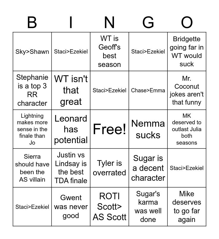 This bingo card has a free space and 29 words: Staci>Ezekiel, Revenge is the best season, Leonard has potential, Season 1 Priya also sucks, Sky>Shawn, WT is Geoff's best season, WT isn't that great, Justin vs Lindsay is the best TDA finale, Nemma sucks, Gwent was never good, MK deserved to outlast Julia both seasons, Mike deserves to go far again, ROTI Scott> AS Scott, Sugar's karma was well done, Mr. Coconut jokes aren't that funny, Bruch of Disgustingness is boring, Tyler is overrated, Sierra should have been the AS villain, Bridgette going far in WT would suck, Lightning makes more sense in the finale than Jo, Sugar is a decent character, Tennis Rivals were robbed, Chase>Emma, Stephanie is a top 3 RR character, Staci>Ezekiel, Staci>Ezekiel, Staci>Ezekiel, Staci>Ezekiel and Staci>Ezekiel.