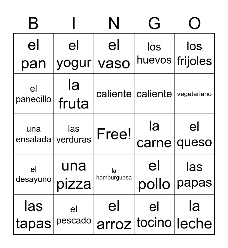 This bingo card has a free space and 44 words: el agua, una pizza, el cereal, el tocino, el huevo, la lechuga, la fruta, la taza, los huevos, la leche, el pan, el pescado, el pollo, el queso, el sandwich, el flan, el arroz, la carne, el tomate, una ensalada, el yogur, la hamburguesa, el helado, los frijoles, la torta, la empanada, caliente, frio, las papas, las tapas, merienda, el vaso, la cola, el jugo de naranja, el desayuno, la merienda, la cena, el almuerzo, vegetariano, el panecillo, las verduras, la mantequilla, caliente and el cafe.