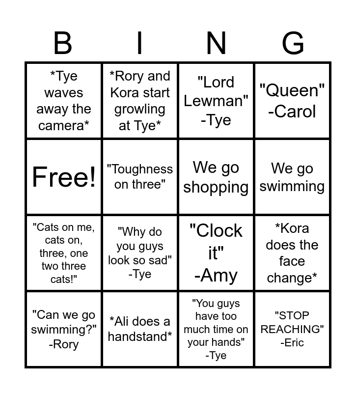 This bingo card has 16 words: *Ali does a handstand*, *Kora does the face change*, "Lord Lewman" -Tye, *Tye waves away the camera*, "Cats on me, cats on, three, one two three cats!", *Rory and Kora start growling at Tye*, "Clock it" -Amy, "You guys have too much time on your hands" -Tye, Free!, "Toughness on three", "Can we go swimming?" -Rory, "Queen" -Carol, "Why do you guys look so sad" -Tye, We go swimming, We go shopping and "STOP REACHING" -Eric.