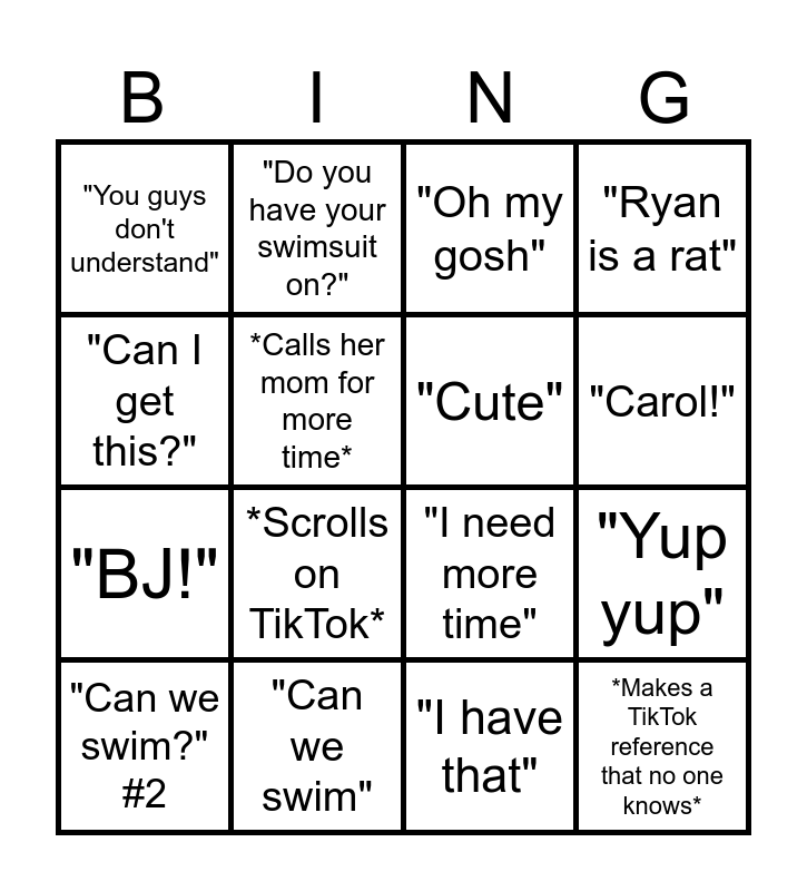 This bingo card has 16 words: "Can we swim", "Yup yup", "Oh my gosh", "You guys don't understand", "BJ!", "Do you have your swimsuit on?", "I need more time", "I have that", "Can I get this?", *Calls her mom for more time*, "Can we swim?" #2, "Ryan is a rat", *Scrolls on TikTok*, "Carol!", "Cute" and *Makes a TikTok reference that no one knows*.