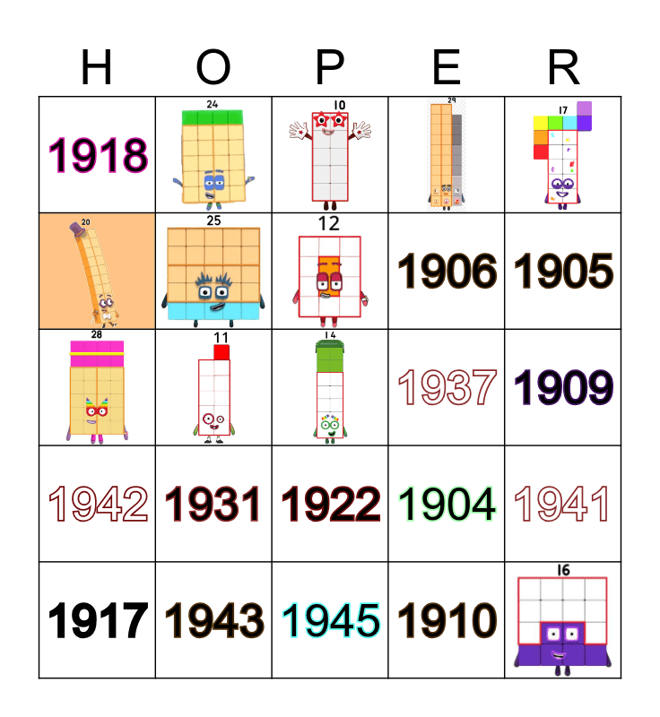 This bingo card has 30 images and 46 words: 1901, 1902, 1903, 1904, 1905, 1906, 1907, 1908, 1909, 1910, 1911, 1912, 1913, 1914, 1915, 1916, 1917, 1918, 1919, 1920, 1921, 1922, 1923, 1924, 1925, 1926, 1927, 1928, 1929, 1930, 1931, 1932, 1933, 1934, 1935, 1936, 1937, 1938, 1939, 1940, 1941, 1942, 1943, 1944, 1945 and 1946.