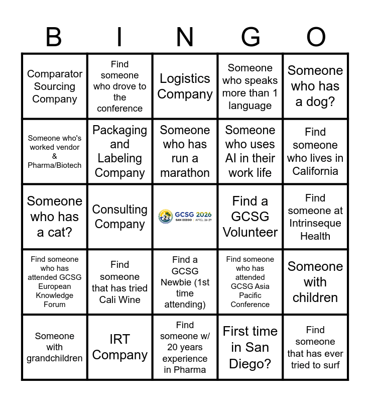 This bingo card has a free space and 30 words: IRT Company, Forecasting Company, Consulting Company, Label Company, Comparator Sourcing Company, Logistics Company, Packaging and Labeling Company, Find a GCSG Newbie (1st time attending), Find a GCSG Volunteer, Find someone w/ 20 years experience in Pharma, Find someone at Intrinseque Health, Find someone that has ever tried to surf, First time in San Diego?, Came to conference from outside US, Find someone who lives in California, Find someone who has attended GCSG US Conference for 10+ times, Find someone who has attended GCSG Asia Pacific Conference, Find someone who has attended GCSG European Knowledge Forum, Find someone that has tried Cali Wine, Someone who has a dog?, Someone who has a cat?, Someone who has a horse?, Find someone who drove to the conference, Someone who uses AI in their work life, Someone who's worked vendor & Pharma/Biotech, Someone who speaks more than 1 language, Someone with children, Someone with grandchildren, Someone who has run a marathon and Someone who has completed an Ironman.