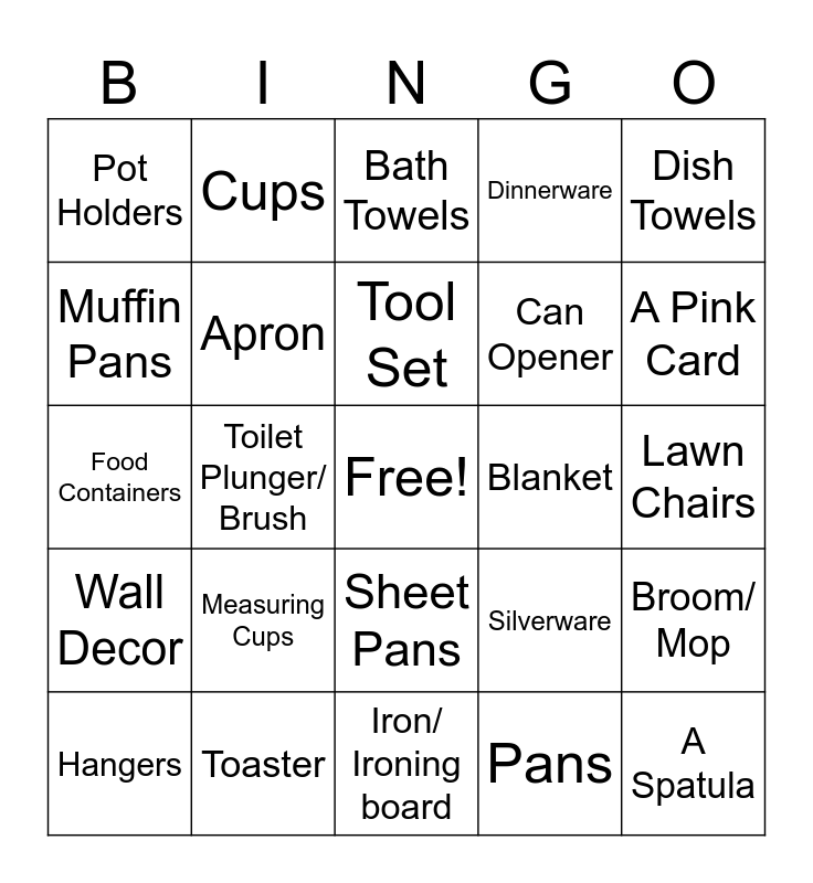This bingo card has a free space and 44 words: A Kitchen Aid product, A Spatula, A Book, Hangers, A Blue Card, Pans, Bath Towels, Pitcher, Dish Towels, Toaster, Dinnerware, Blanket, Sheet Pans, Measuring Cups, Pillow Cases, Iron/ Ironing board, Casserole Dish, Food Containers, Crock Pot, A Pink Card, Cups, Laundry Basket, Mixing Bowls, Pot Holders, Gift Card, Lawn Chairs, Toaster Oven, Coffee Maker, Silverware, Wall Decor, Board Game, Broom/ Mop, Step Ladder, Trashcan, Toilet Plunger/ Brush, Meat Thermometer, Bag Clips, Cutting Board, Tool Set, Muffin Pans, Can Opener, Oven Mitts, Apron and Bed Sheets.