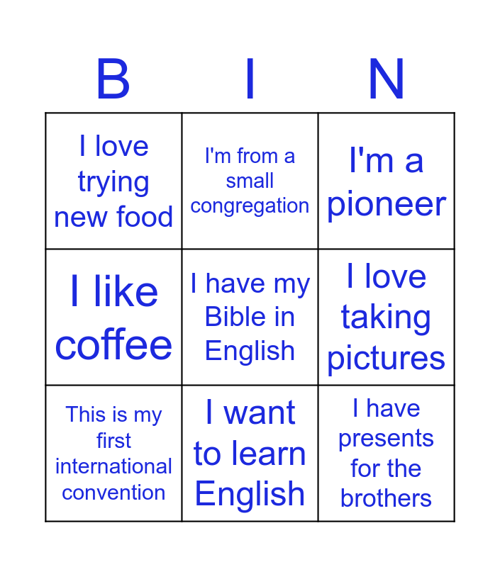 This bingo card has 9 words: This is my first international convention, I'm a pioneer, I'm from a small congregation, I like coffee, I love trying new food, I love taking pictures, I have my Bible in English, I have presents for the brothers and I want to learn English.
