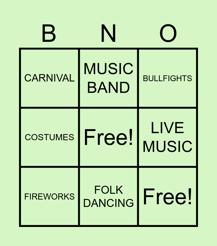 This bingo card has a free space and 17 words: BEAUTY CONTEST, BULL, BULLFIGHTS, CARNIVAL, CONCERTS, COSTUMES, FOOD, FIREWORKS, FOLK DANCING, LIVE MUSIC, SPORTING EVENTS, MASKS, Free!, MUSIC BAND, OXCARTS, PARADES and STREET FAIRS.