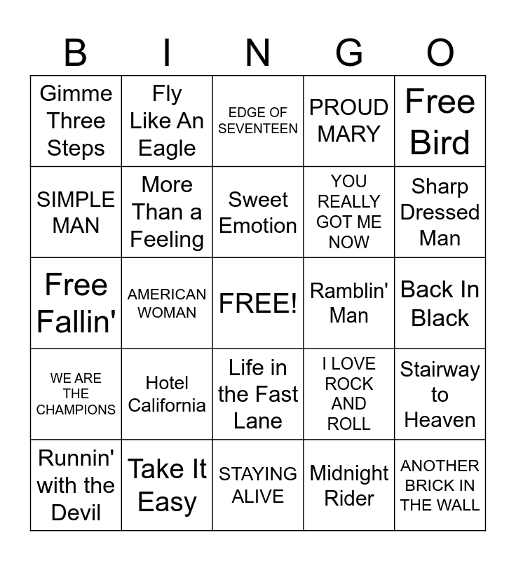 This bingo card has a free space and 37 words: BAD TO THE BONE, BORN TO BE WILD, HOUSE OF THE RISING SON, More Than a Feeling, Stairway to Heaven, Hotel California, Sweet Emotion, THE JOKER, Free Bird, Bad Moon Rising, AMERICAN WOMAN, PROUD MARY, ANOTHER BRICK IN THE WALL, Back In Black, SIMPLE MAN, WE ARE THE CHAMPIONS, Peace of Mind, EDGE OF SEVENTEEN, Life in the Fast Lane, Ramblin' Man, Gimme Three Steps, Sharp Dressed Man, Runnin' with the Devil, STAYING ALIVE, Take The Money And Run, Midnight Rider, Fly Like An Eagle, Magic Carpet Ride, Black Water, Funk #49, The Boys Are Back In Town, Take It Easy, Free Fallin', I GOT YOU BABE, I LOVE ROCK AND ROLL, YOU REALLY GOT ME NOW and HERE I GO AGAIN.
