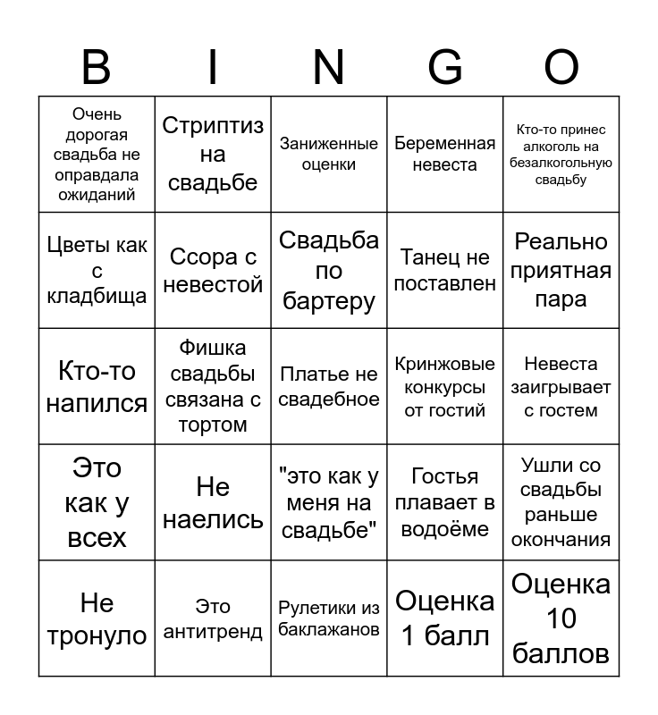 This bingo card has 25 words: Не наелись, Рулетики из баклажанов, Свадьба по бартеру, Не тронуло, Кто-то принес алкоголь на безалкогольную свадьбу, Очень дорогая свадьба не оправдала ожиданий, Цветы как с кладбища, Стриптиз на свадьбе, Кринжовые конкурсы от гостий, "это как у меня на свадьбе", Танец не поставлен, Кто-то напился, Гостья плавает в водоёме, Ушли со свадьбы раньше окончания, Ссора с невестой, Оценка 10 баллов, Невеста заигрывает с гостем, Заниженные оценки, Реально приятная пара, Фишка свадьбы связана с тортом, Платье не свадебное, Это антитренд, Это как у всех, Беременная невеста and Оценка 1 балл.