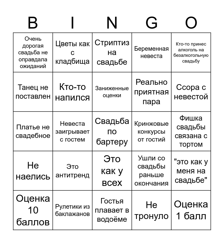 This bingo card has 25 words: Не наелись, Рулетики из баклажанов, Свадьба по бартеру, Не тронуло, Кто-то принес алкоголь на безалкогольную свадьбу, Очень дорогая свадьба не оправдала ожиданий, Цветы как с кладбища, Стриптиз на свадьбе, Кринжовые конкурсы от гостий, "это как у меня на свадьбе", Танец не поставлен, Кто-то напился, Гостья плавает в водоёме, Ушли со свадьбы раньше окончания, Ссора с невестой, Оценка 10 баллов, Невеста заигрывает с гостем, Заниженные оценки, Реально приятная пара, Фишка свадьбы связана с тортом, Платье не свадебное, Это антитренд, Это как у всех, Беременная невеста and Оценка 1 балл.