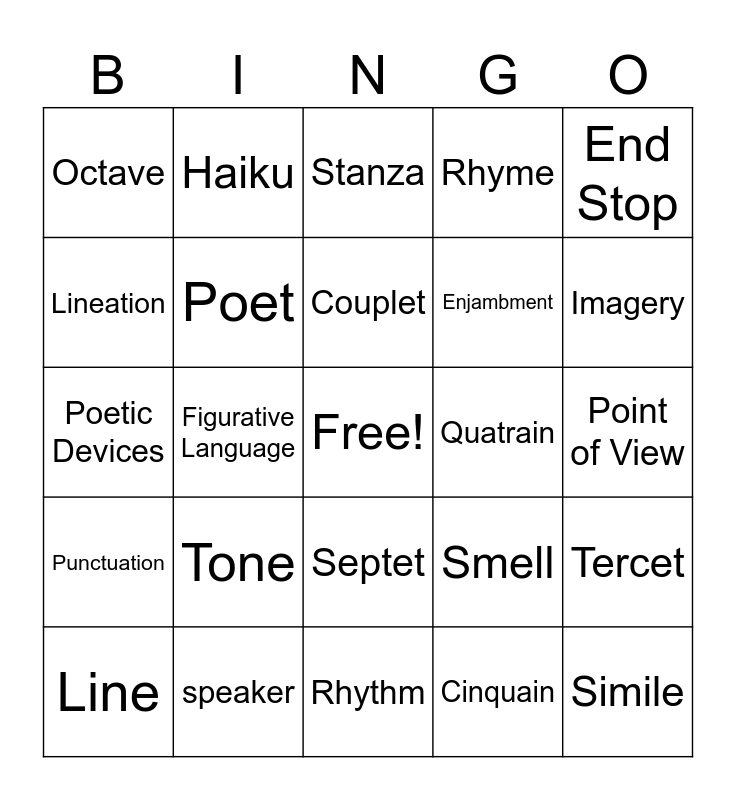 This bingo card has a free space and 24 words: Tone, speaker, Couplet, Line, End Stop, Octave, Lineation, Haiku, Quatrain, Septet, Enjambment, Poetic Devices, Smell, Tercet, Poet, Cinquain, Point of View, Stanza, Imagery, Figurative Language, Simile, Punctuation, Rhyme and Rhythm.