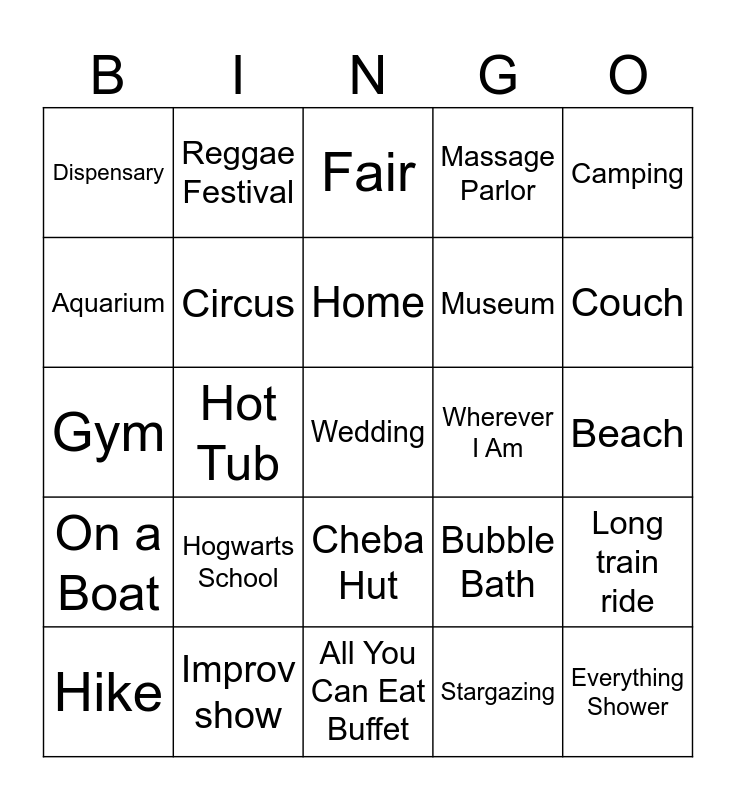 This bingo card has 40 words: Picnic, Gym, Trampoline, Circus, Improv show, Cheba Hut, Home, Backyard, Camping, On a Boat, Hot Tub, Massage Parlor, Wedding, Beach, Wherever I Am, Hogwarts School, Game Night, Dispensary, Biergarten, Fair, Long train ride, Stargazing, Museum, Aquarium, Zoo, Concert, Hotel room, Arcade, Everything Shower, Pool, AirBnB, Hike, Escape Room, Bubble Bath, Couch, All You Can Eat Buffet, Vegas, Downtown Sounds, Reggae Festival and Movie Theatre.