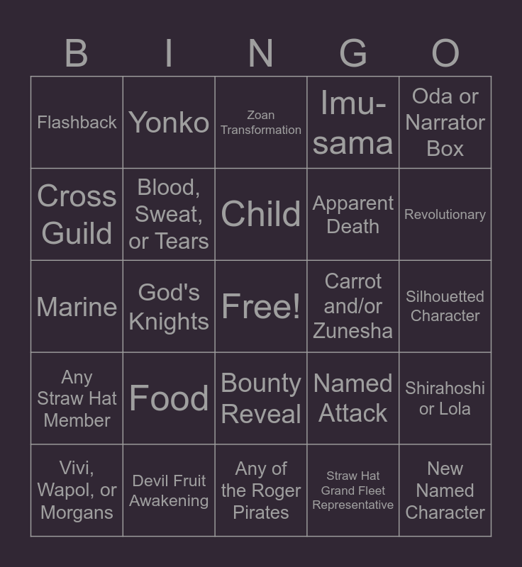 This bingo card has a free space and 29 words: Vivi, Wapol, or Morgans, Kid or Heart Pirates, God's Knights, New Named Devil Fruit, Flashback, Zoan Transformation, Blood, Sweat, or Tears, Food, Carrot and/or Zunesha, Devil Fruit Awakening, Silhouetted Character, New Named Character, Any of the Roger Pirates, Straw Hat Grand Fleet Representative, Revolutionary, Joy Boy or Nika Mentioned, Bounty Reveal, Any Straw Hat Member, Oda or Narrator Box, Marine, Named Attack, Luffy Meets Imu, Apparent Death, Cross Guild, Imu-sama, Yonko, Shirahoshi or Lola, Child and Gorosei.