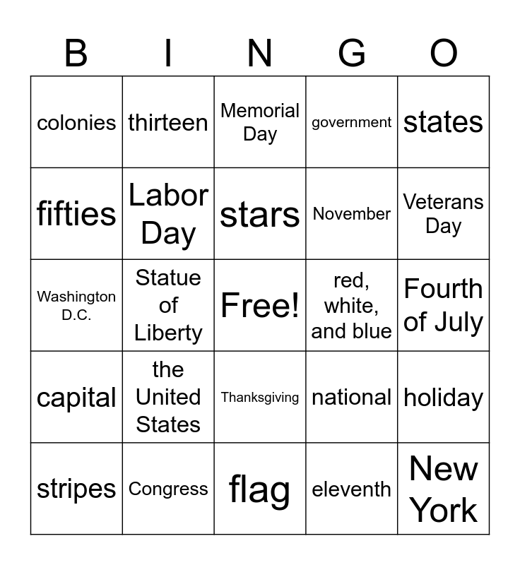 This bingo card has a free space and 25 words: the United States, flag, stars, stripes, states, colonies, fifties, thirteen, red, white, and blue, Thanksgiving, November, Washington D.C., national, holiday, Labor Day, Independence Day, Fourth of July, Memorial Day, Veterans Day, Statue of Liberty, New York, Congress, capital, government and eleventh.