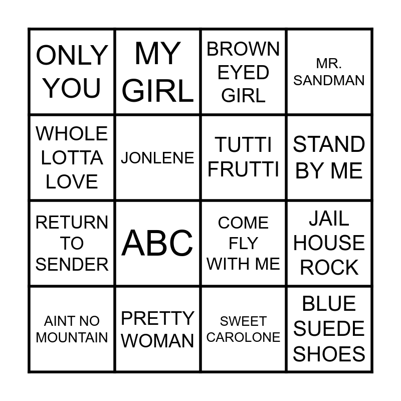 This bingo card has 16 words: PRETTY WOMAN, JAIL HOUSE ROCK, BROWN EYED GIRL, ONLY YOU, RETURN TO SENDER, MY GIRL, COME FLY WITH ME, SWEET CAROLONE, WHOLE LOTTA LOVE, JONLENE, AINT NO MOUNTAIN, MR. SANDMAN, ABC, STAND BY ME, TUTTI FRUTTI and BLUE SUEDE SHOES.