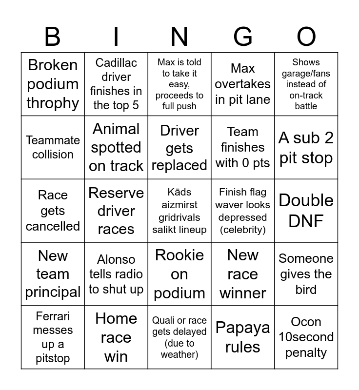 This bingo card has 25 words: Alonso tells radio to shut up, Quali or race gets delayed (due to weather), Driver gets replaced, Ferrari messes up a pitstop, Shows garage/fans instead of on-track battle, Broken podium throphy, Teammate collision, Cadillac driver finishes in the top 5, Finish flag waver looks depressed (celebrity), Rookie on podium, Team finishes with 0 pts, Race gets cancelled, New race winner, Someone gives the bird, Animal spotted on track, Ocon 10second penalty, Double DNF, Max is told to take it easy, proceeds to full push, A sub 2 pit stop, Reserve driver races, Kāds aizmirst gridrivals salikt lineup, Home race win, New team principal, Max overtakes in pit lane and Papaya rules.