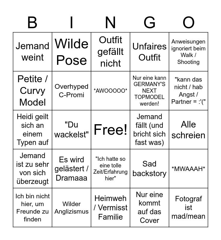 This bingo card has a free space and 24 words: Es wird gelästert / Dramaaa, Wilder Anglizismus, *AWOOOOO*, Ich bin nicht hier, um Freunde zu finden, Anweisungen ignoriert beim Walk / Shooting, Jemand weint, Petite / Curvy Model, Wilde Pose, Jemand fällt (und bricht sich fast was), "Ich hatte so eine tolle Zeit/Erfahrung hier", Nur eine kann GERMANY'S NEXT TOPMODEL werden!, Heidi geilt sich an einem Typen auf, Sad backstory, *MWAAAH*, Overhyped C-Promi, Nur eine kommt auf das Cover, Alle schreien, Outfit gefällt nicht, "kann das nicht / hab Angst / Partner = :'(", "Du wackelst", Fotograf ist mad/mean, Jemand ist zu sehr von sich überzeugt, Unfaires Outfit and Heimweh / Vermisst Familie.