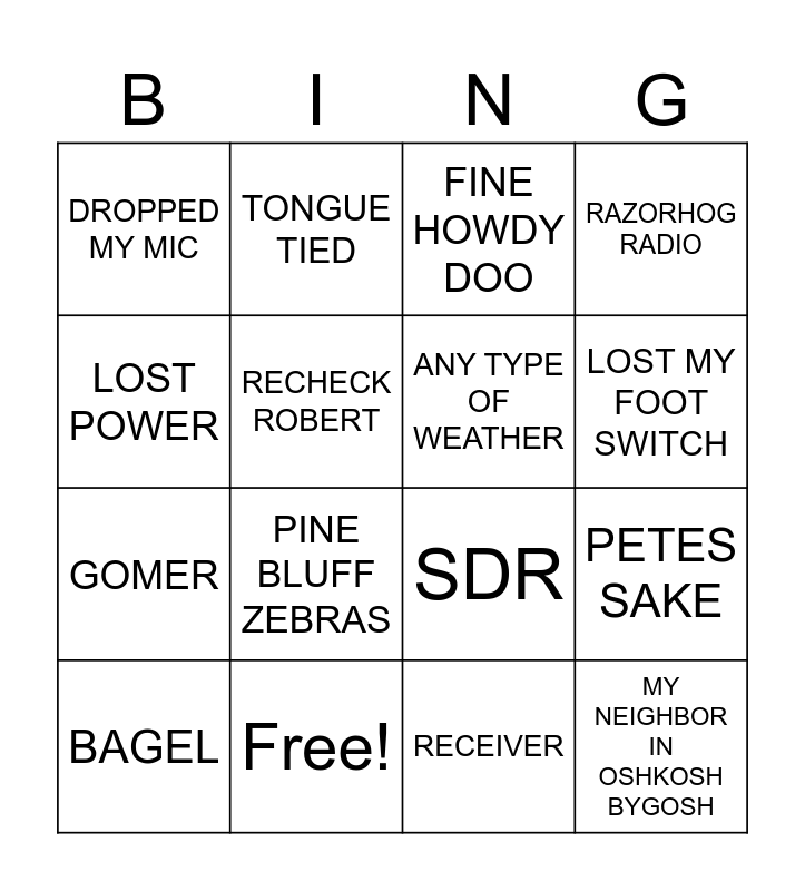 This bingo card has 16 words: Free!, PETES SAKE, FINE HOWDY DOO, DROPPED MY MIC, GOMER, TONGUE TIED, SDR, RECEIVER, LOST POWER, RECHECK ROBERT, BAGEL, RAZORHOG RADIO, PINE BLUFF ZEBRAS, LOST MY FOOT SWITCH, ANY TYPE OF WEATHER and MY NEIGHBOR IN OSHKOSH BYGOSH.