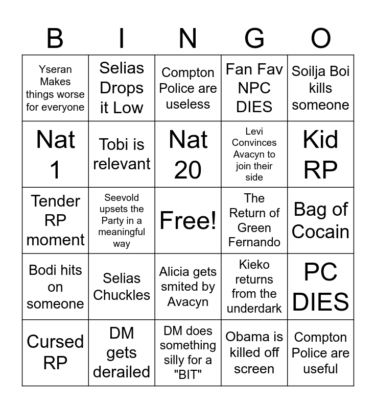 This bingo card has a free space and 24 words: Selias Chuckles, DM gets derailed, Nat 20, Cursed RP, Soilja Boi kills someone, Yseran Makes things worse for everyone, Nat 1, Selias Drops it Low, The Return of Green Fernando, Alicia gets smited by Avacyn, Levi Convinces Avacyn to join their side, Tender RP moment, Kieko returns from the underdark, PC DIES, Tobi is relevant, Obama is killed off screen, Bag of Cocain, Compton Police are useless, Kid RP, Seevold upsets the Party in a meaningful way, Compton Police are useful, Bodi hits on someone, Fan Fav NPC DIES and DM does something silly for a "BIT".