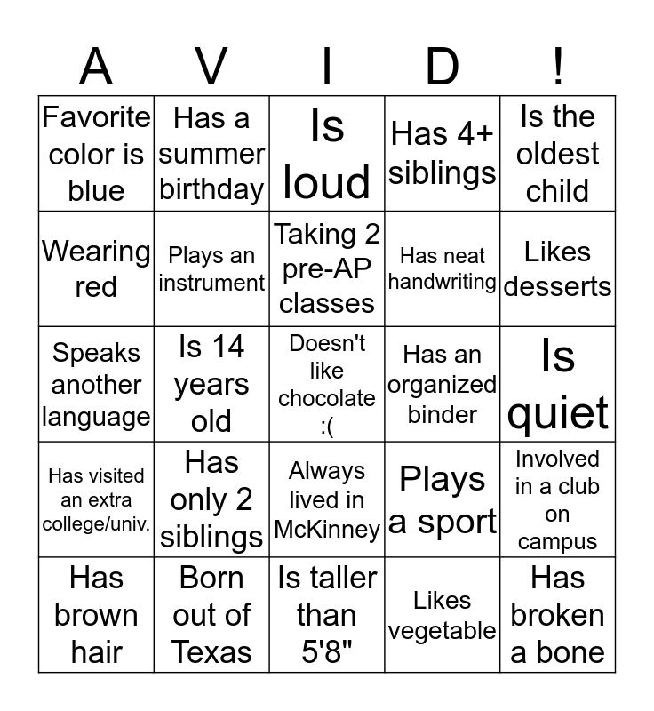 This bingo card has a free space and 24 words: Has only 2 siblings, Born out of Texas, Taking 2 pre-AP classes, Has brown hair, Is the oldest child, Favorite color is blue, Wearing red, Has a summer birthday, Has an organized binder, Always lived in McKinney, Has neat handwriting, Speaks another language, Plays a sport, Involved in a club on campus, Plays an instrument, Likes vegetable, Is quiet, Is loud, Likes desserts, Is 14 years old, Has broken a bone, Has visited an extra college/univ., Has 4+ siblings and Is taller than 5'8".