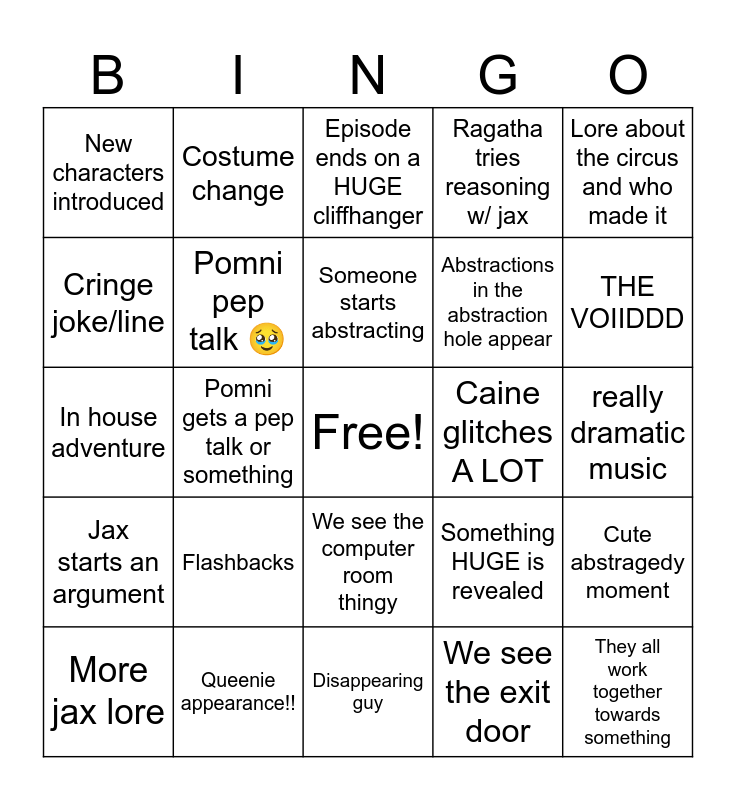 This bingo card has a free space and 24 words: Flashbacks, Queenie appearance!!, Someone starts abstracting, More jax lore, Lore about the circus and who made it, New characters introduced, Cringe joke/line, Costume change, Caine glitches A LOT, We see the computer room thingy, Abstractions in the abstraction hole appear, In house adventure, Something HUGE is revealed, Cute abstragedy moment, Pomni pep talk 🥹, We see the exit door, really dramatic music, Episode ends on a HUGE cliffhanger, THE VOIIDDD, Pomni gets a pep talk or something, They all work together towards something, Jax starts an argument, Ragatha tries reasoning w/ jax and Disappearing guy.