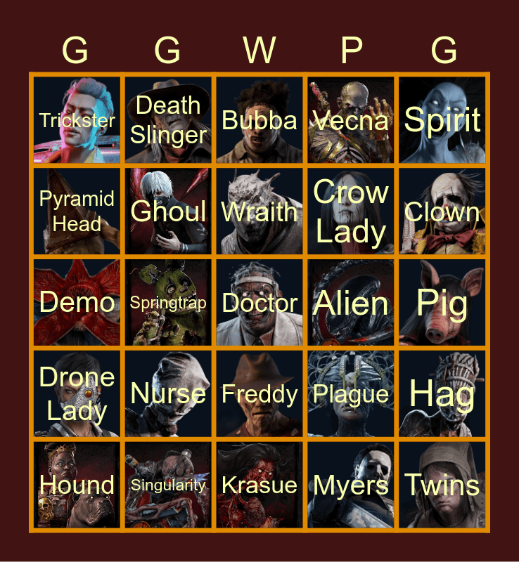 This bingo card has 42 images and 42 words: Trapper, Wraith, Hillbilly, Nurse, Myers, Hag, Doctor, Huntress, Bubba, Freddy, Pig, Clown, Springtrap, Spirit, Legion, Plague, Ghostface, Demo, Oni, Death Slinger, Pyramid Head, Blight, Twins, Trickster, Nemesis, Pinhead, Crow Lady, Sadako, Dredge, Wesker, Knight, Drone Lady, Ghoul, Krasue, Henry Vecna, Hound, Singularity, Alien, Chucky, Unknown, Vecna and Dracula.