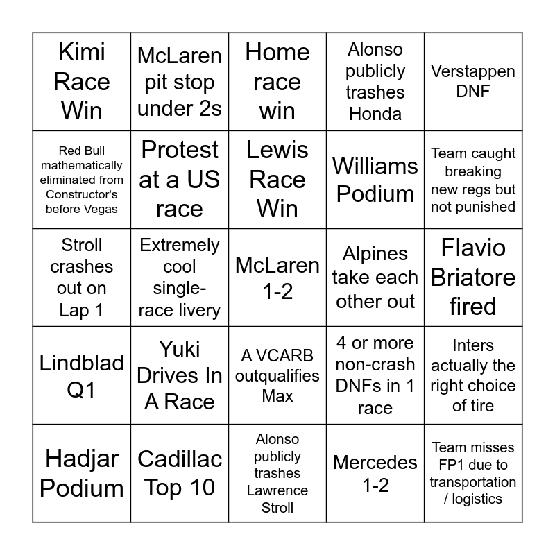 This bingo card has a free space and 24 words: Yuki Drives In A Race, Cadillac Top 10, Lewis Race Win, Hadjar Podium, Verstappen DNF, Kimi Race Win, Red Bull mathematically eliminated from Constructor's before Vegas, McLaren pit stop under 2s, Alpines take each other out, A VCARB outqualifies Max, Williams Podium, Stroll crashes out on Lap 1, 4 or more non-crash DNFs in 1 race, Inters actually the right choice of tire, Protest at a US race, Mercedes 1-2, Flavio Briatore fired, Home race win, Team caught breaking new regs but not punished, Extremely cool single-race livery, Team misses FP1 due to transportation / logistics, Lindblad Q1, Alonso publicly trashes Honda and Alonso publicly trashes Lawrence Stroll.