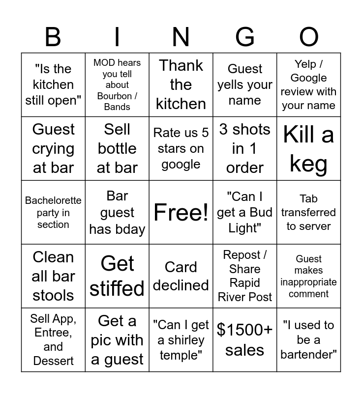 This bingo card has a free space and 33 words: Guest orders 5 shots, Guest breaks bar glass, Bar guest has bday, 25% or more tip, Clean all bar stools, Sell bottle at bar, Yelp / Google review with your name, Sell App, Entree, and Dessert, MOD hears you tell about Bourbon / Bands, Guest compliments you to MOD, Rate us 5 stars on google, Thank the kitchen, Customer orders flight, Guest requests TV channel we don't have, "Can I get a Bud Light", Kill a keg, Get a pic with a guest, Bachelorette party in section, Get stiffed, Repost / Share Rapid River Post, Card declined, Cut off a guest, "Is the kitchen still open", Tab transferred to server, "Can I get a shirley temple", "I used to be a bartender", Guest yells your name, 3 shots in 1 order, Guest crying at bar, Guest makes inappropriate comment, Guest orders in service well, $1500+ sales and Sing guest happy birthday.