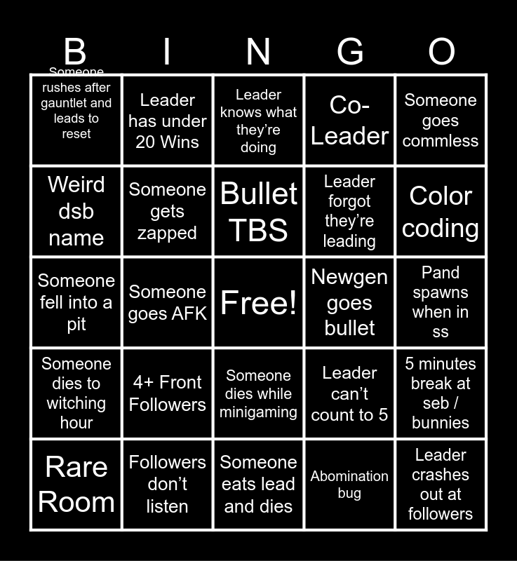 This bingo card has a free space and 110 words: Blacklisted for no reason, “Show your wins”, Newgen goes bullet, Someone has to go in the middle of a run, Waiting in lobby for 15+ minutes, TBS cancelled, VC only but leader doesn’t talk, Leader only allows 8, Leader dies and blames it on follower(s), Defib someone at FSL, No Firewall tech, Leader makes followers line up, Leader threatens everyone, Leader uses a PSS/SS that isn’t actually PSS/SS, No damageless abomination, "SS" when it's PSS, Someone fell into a pit, Someone got blacklisted, Back Leader, DO NOTTTT follow the fish, 5 minutes break at seb / bunnies, Bug abuse, Lopee got someone, No defib used, Leader complains about opening door in dark room, Bullet TBS, Someone goes commless, More than 1 person doing GE, Someone is trolling, Someone DC’d at Ridge, Color coding, Co-Leader, Leader knows what they’re doing, Follower freaks out for no reason, First GE in 15+ minutes, Leader crashes out at followers, Ridge teams, TBS win, Followers don’t listen, Leader dies, Someone gets killed by Seb, 3+ Defibs wasted, Leader forgot they’re leading, Someone goes AFK, Leader can’t count to 5, Someone doesn’t load in, Leader misses obvious pss/ss, Someone disconnects, High ping, Run has 10+ players, Someone does GE and dies, VC only, Abomination bug, Someone sells the run, Followers are better than Leader, Someone goes AFK for over 10 minutes, Headcount, Someone gets stuck on the ceiling after defib, Someone asks for the strat in ridge, Someone gets zapped, Someone rushes after gauntlet and leads to reset, Someone void lopees, Someone dies at searchlights, 0 Wins player, Late flicker kills someone, 4+ Front Followers, Follower trashtalks the leader, "How do u do that tech?", Everyone already has TBS, Someone died without dropping defib, Flooded Comms, Silent Comms, Leader has under 20 Wins, Someone gets GP’d, Someone gets a beatdown (Divine), Someone dies at first angler, Someone minigames for no reason, Pand spawns when in ss, Someone uses a revive token or ghosted, John rotary clip, Someone crashes out over death, Someone dies to explosives, Someone misposition in ss/pss, Animation bug (post-defib), "U sure ts is pss/ss?/ts not pss/ss", Someone dies to wd/candles/void, Gummylight spammer, Someone gets softlocked, "I need a light/I'm lost", Someone gets bonked by a fan, Someone refuses to dispatch of redeemer, Weird dsb name, "Give my item back", Someone dies to witching hour, Chase assist on, Only 1 or 2 people doing gens, Soundboard people, Leader tells you to claim lockers, Someone dies to chainsmoker, Someone eats lead and dies, Frangler lopee, Someone gets flung by void locker, No pandemonium (has to reach fsl), Rare Room, Someone dies while minigaming, Rare monster (A60, Mirage, Styx), Someone dies to PDG, Trenchbleeder is about to pass through the area, "I need to get this other badge in this run specifically" and "Pick up your DSB".